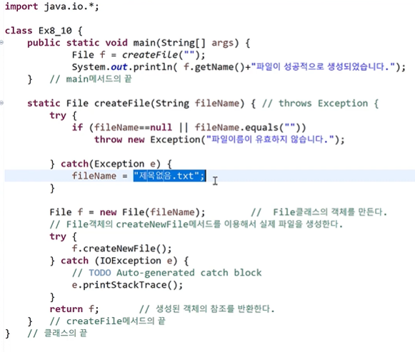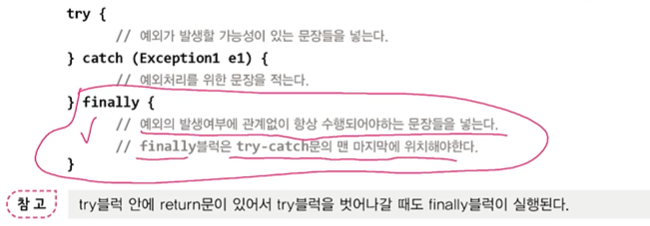 - 예외를 처리하는 방법 : try-catch문(직접 처리), 예외 선언하기(예외 떠넘기기=알리기), 은폐하기(빈 catch블럭을 사용)