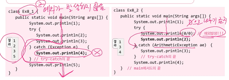 오른쪽은 0을 0으로 나누는 것이 예외이므로 catch문으로 출력.