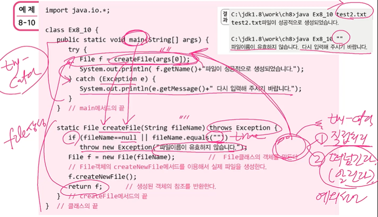 => try-catch문을 예외가 발생한 곳에서 선언할 수도 있고 메서드를 호출한 쪽에서 예외를 선택할 수 있다.