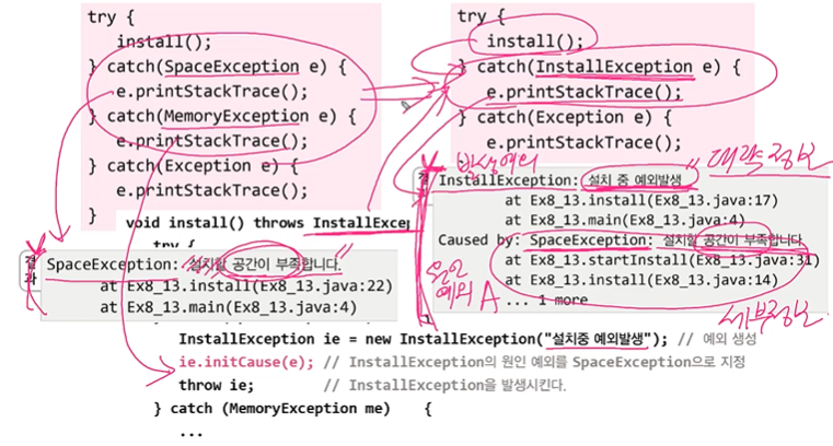 => lnstallException이라는 큰 예외 객체를 생성해서 그 안에 ie.initCause(e)로 둘을 연결시켜주었다. (연결하는 작업만 함)