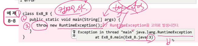 오른쪽 RuntimeException()은 언체크드 예외이기 때문에 컴파일은 되지만 비정상종료.