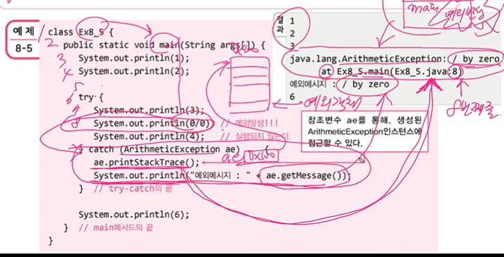 예외가 발생하면 예외 객체가 만들어지고 예외 객체에는 예외에 대한 정보가 들어있다.