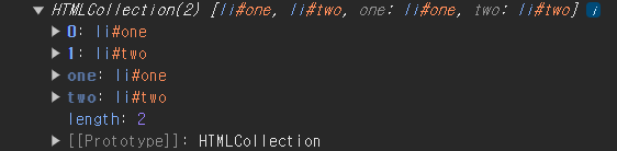 - HTMLCollection은 배열이 아니라 유사 배열입니다. Array 메서드를 직접 사용할 수 없지만, for...of나 for 루프를 통해 요소에 접근할 수 있습니다.