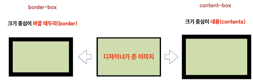- border-box : border가 고정되고 contents의 크기가 변합니다. (콘텐츠 변동, 박스가 고정)