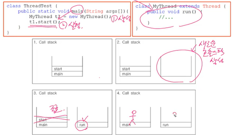 => 반드시 start로 호출해야 서로 독립적인 작업을 수행할 수 있다. 그래서 run을 호출하는 것이 아니라 start를 호출!