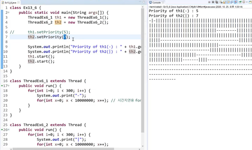 우선순위를 변경하고 싶으면 setPriority로 (7)과 같이 변경할 수도 있다.