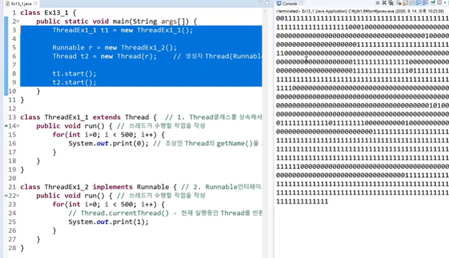 => 쓰레드를 t1, t2로 생성해서 두개를 굴리고 있기 때문에 동시에 굴러간다! 0000111이 아니라 001100..