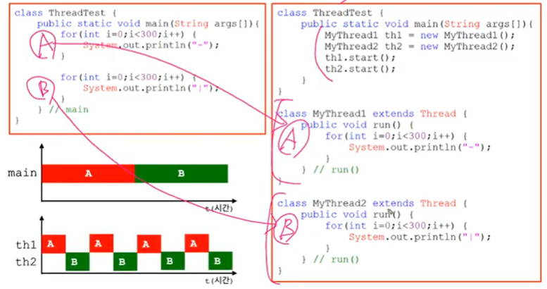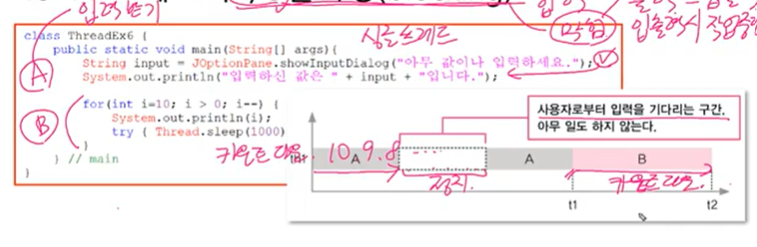 싱글쓰레드에선 A와 B의 객체가 따로 수행되기 때문에 A에서 입력을 받을때까지 기다려야한다.