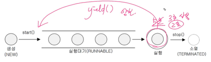 - 남은 시간을 다음 쓰레드에게 양보하고, 자신(현재 쓰레드)은 실행대기한다.