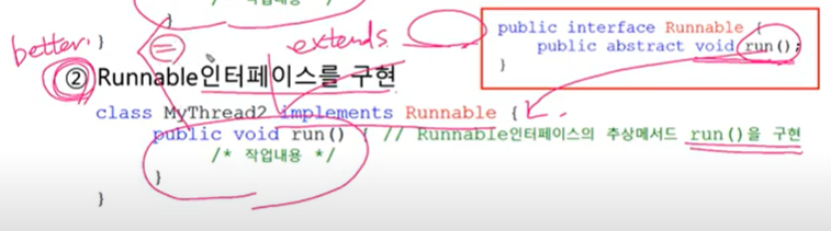 => 자바는 단일 상속이기 때문에 쓰레드를 구현하면 다른 객체를 상속받지 못하므로 인터페이스 구현이 best