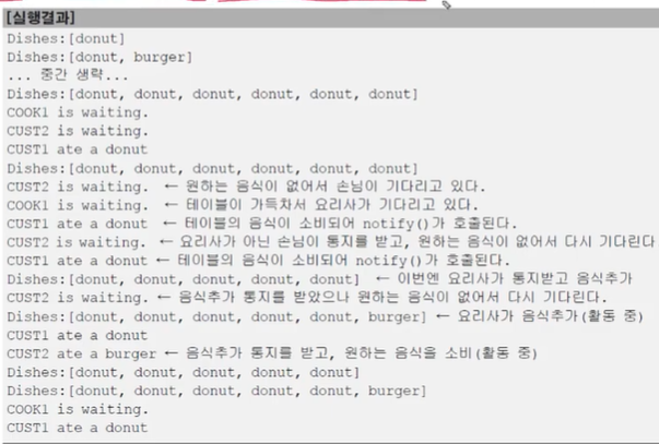 => 요리사는 테이블이 가득 차면 대기wait하고, 음식을 추가하고 나면 손님에게 notify한다.