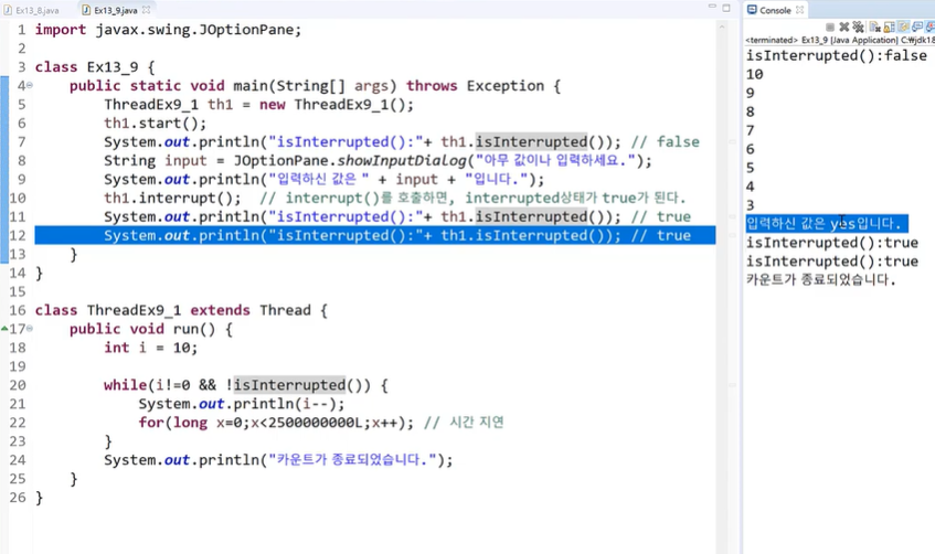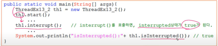isInterrupted는 static이 아니므로 th1.으로 하면 th1 쓰레드의 인터럽트 값을 반환해주지만