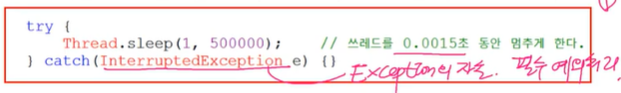 - 예외 처리를 해야한다.(InterruptedException 가 발생하면 작업 재개)