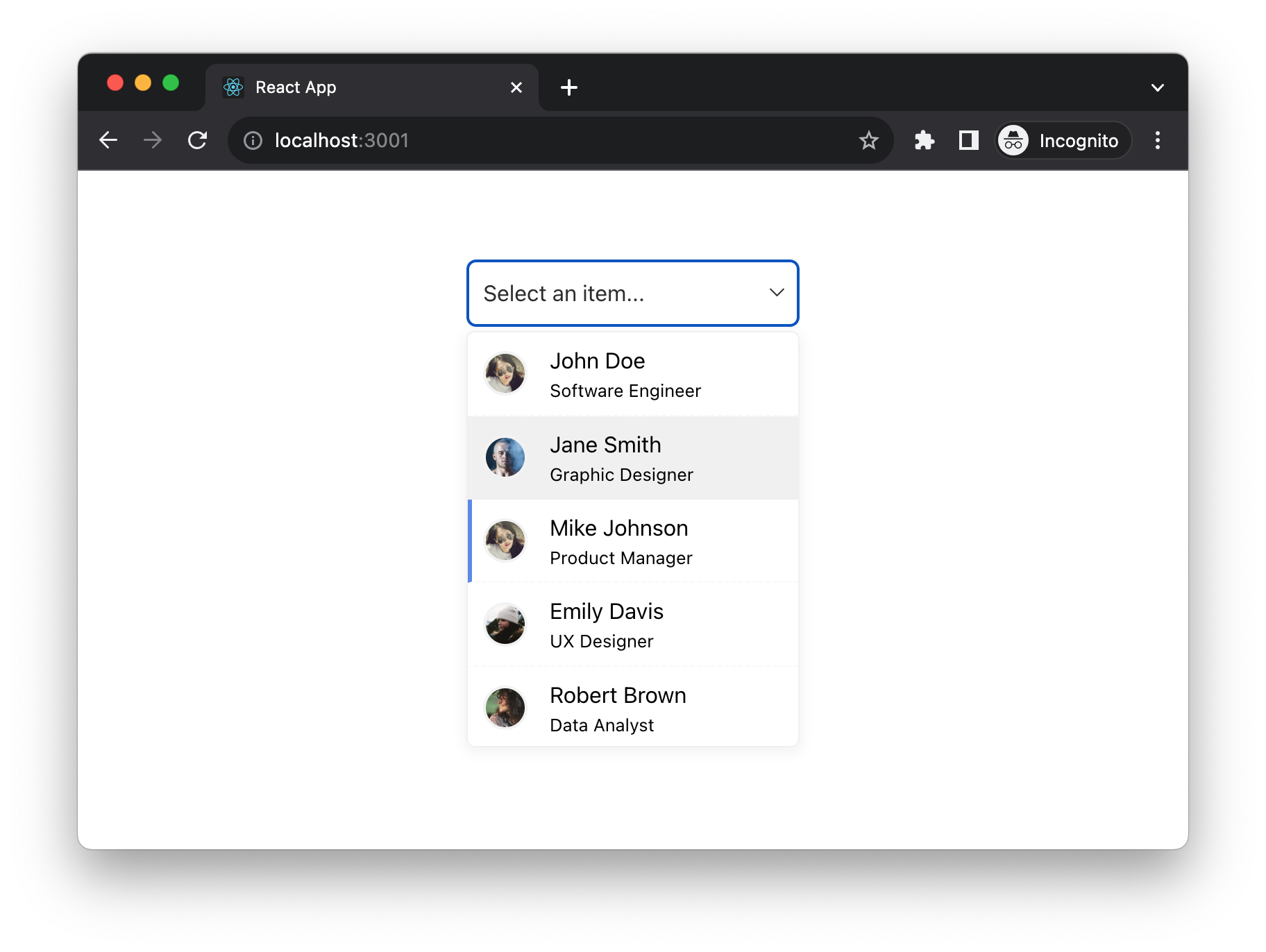 위 이미지에 표시된 것처럼 “Select an item…” 트리거 요소를 클릭하여 드롭다운을 열 수 있습니다.