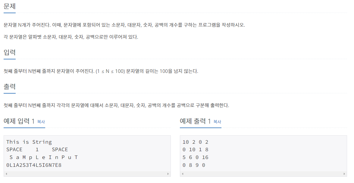 문자열 N개를 입력받아 소문자, 대문자, 숫자, 공백 순으로 각각 개수를 반환하는 문제입니다.