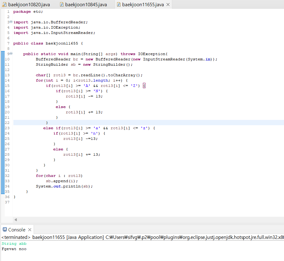 char[] rot13 = br.readLine().toCharArray(); //StringBuilder를 한 글자씩 toCharArray로 쪼개서 배열로 저장