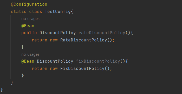 => return값이 RateDiscountPolicy였으므로 RateDiscountPolicy class를 Bean으로 갖는 것을 bean으로 하고