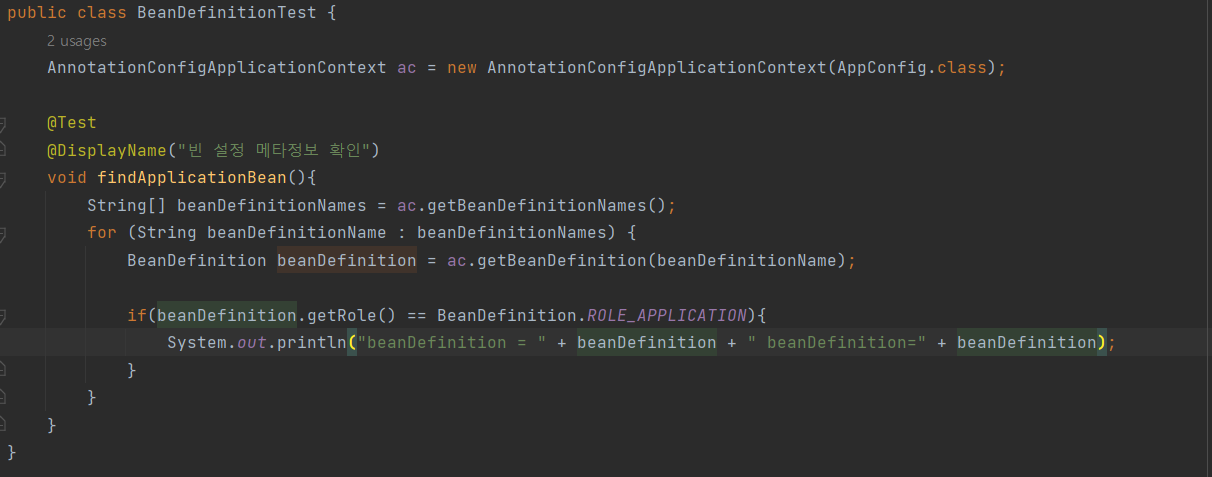 beanDefintion.getRole() == BeanDefinition.ROLE_APPLICATION - 빈의 역할이 애플리케이션인 것
