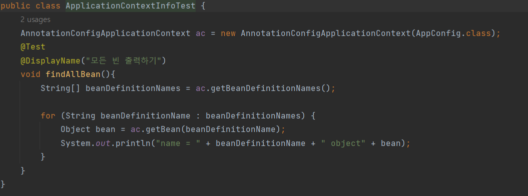 ac.getBeanDefinitionNames() : 스프링에 등록된 모든 빈 이름을 조회한다.