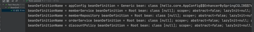BeanDefintion을 통해 애플리케이션 빈의 상세 메타 정보를 결과값으로 확인할 수 있다.