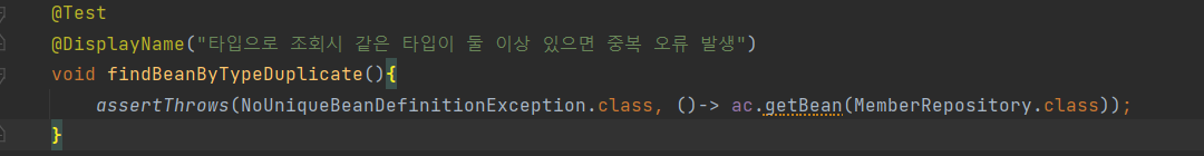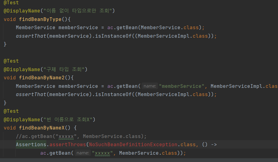 - 선언되지 않은 이름을 조회하면 에러가 발생하기 때문에 Assertions.assertThrows로 예외처리를 해줘야한다.