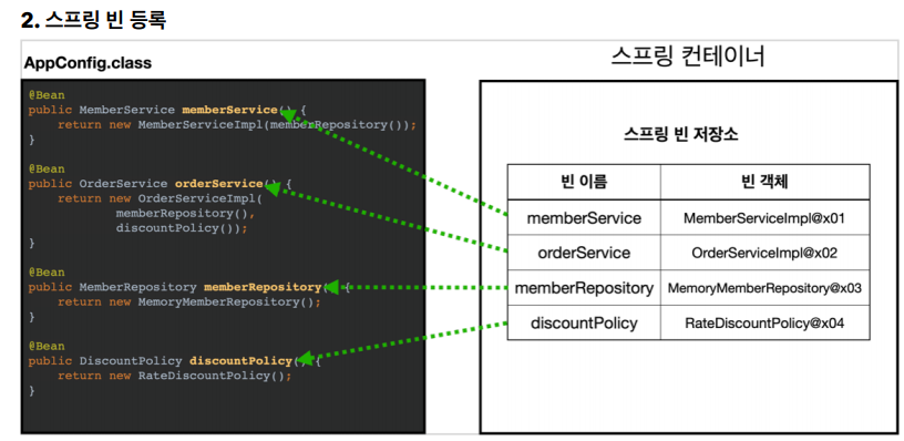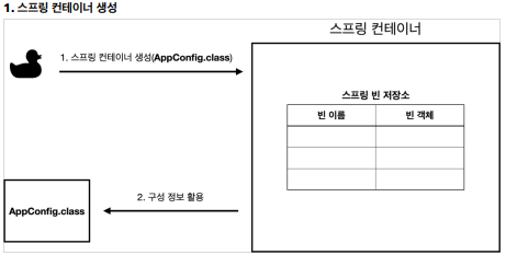 - 스프링 컨테이너는 파라미터로 넘어온 설정 클래스 정보를 사용해서 스프링 빈을 등록한다.