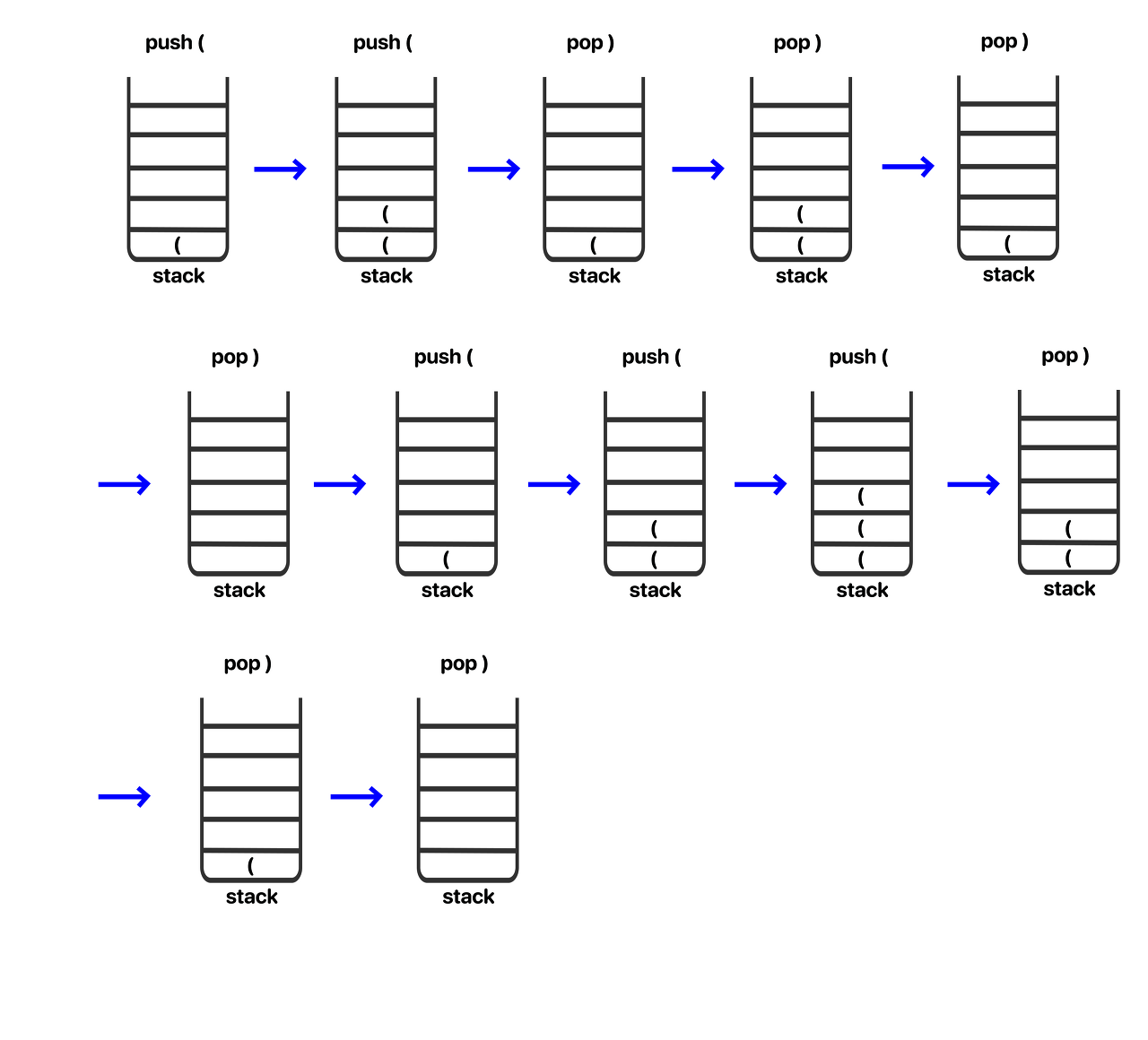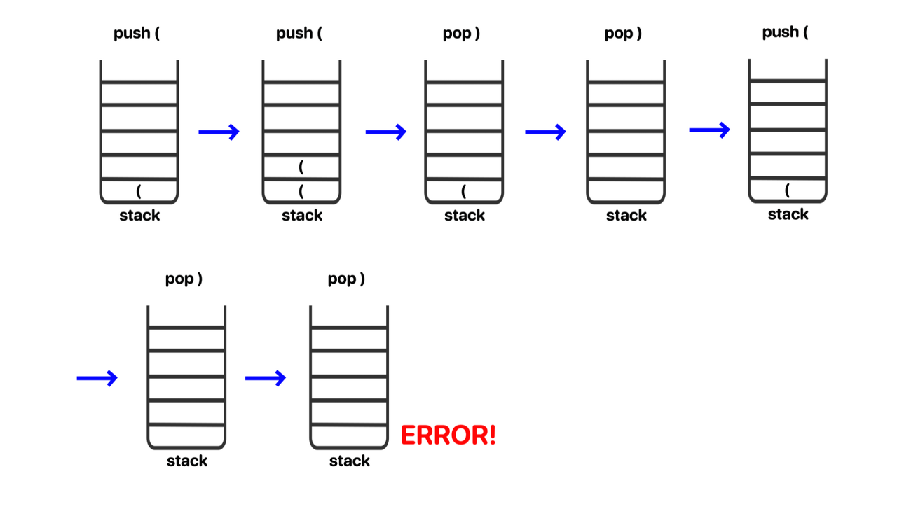 보면 알겠지만, 이미 6번째 단계에서 pop 을 하면 스택은 비어버리게 된다. 스택이 비었다는 것은 현재 단계까지는 완전한 수식이라는 것이다. 근데 그 다음 단계에서도 닫는 괄호가 나온다면 이미 비어있는 상태에서 더이상 pop 할 요소가 없기 때문에 이는 잘못 된 참조가 되어버리게 된다.