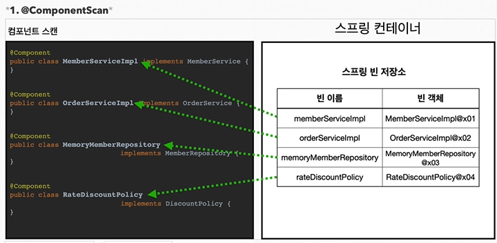 => 컴포넌트 스캔은 이름 그대로 @Component 애노테이션이 붙은 클래스를 스캔해서 스프링 빈으로 등록한다.