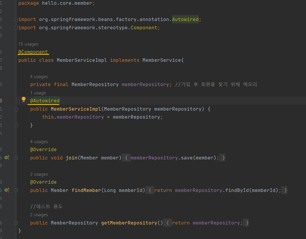 - 구현체(~Impl)에서 생성자 위에 @Autowired를 적어주면 @Autowired 의존관계를 자동으로 주입해준다.