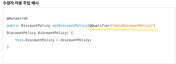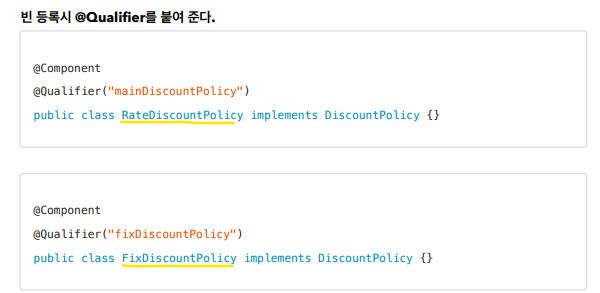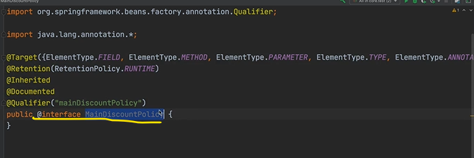 @MainDiscountPolicy에 @Qualifier("mainDiscountPolicy")가 있기 때문에 자동으로 @MainDiscountPolicy을 써주면