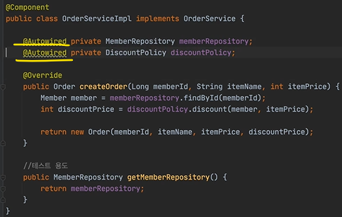 그런데 막상 실행 결과는 NPE(Null Point Exception)이 발생하는데, memberRepository, discountPolicy