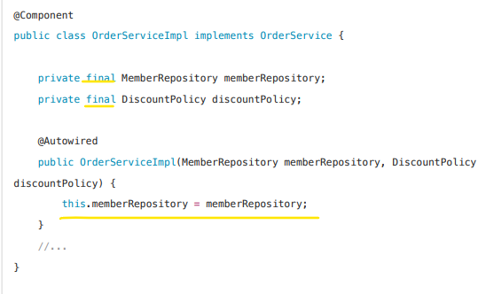> 참고: 수정자 주입을 포함한 나머지 주입 방식은 모두 생성자 이후에 호출되므로, 필드에 final 키워드를