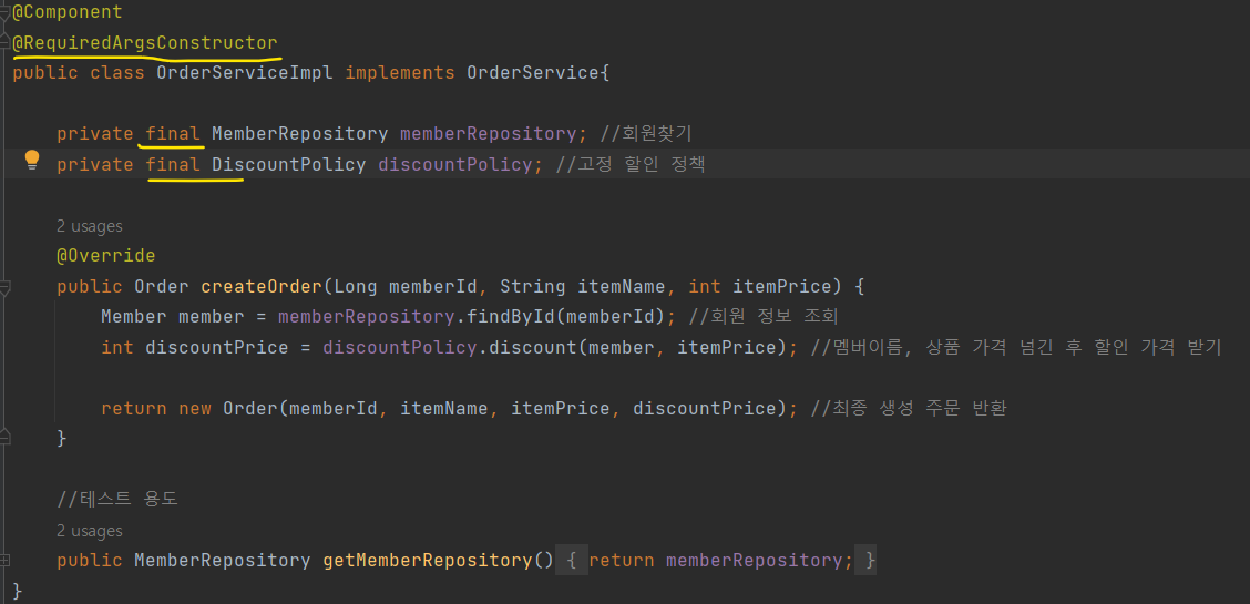 막상 개발을 해보면, 대부분이 다 불변이고, 그래서 다음과 같이 필드에 final 키워드를 사용하게 된다.