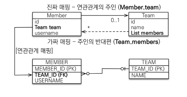 주인은 외래키가 있는 곳으로 정하자 즉, '다'쪽(Member)을 주인으로 하자