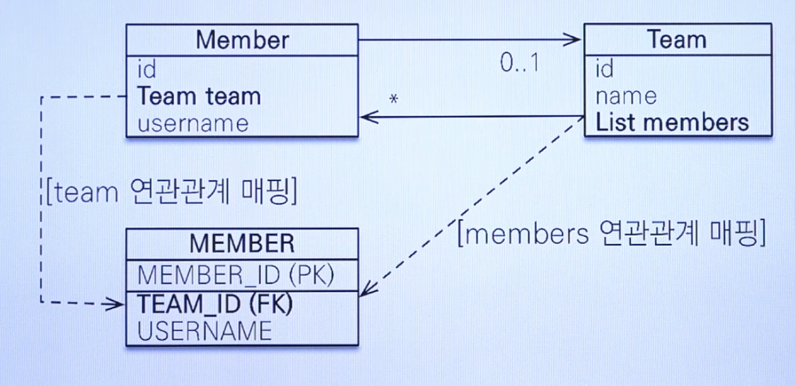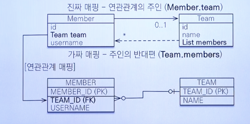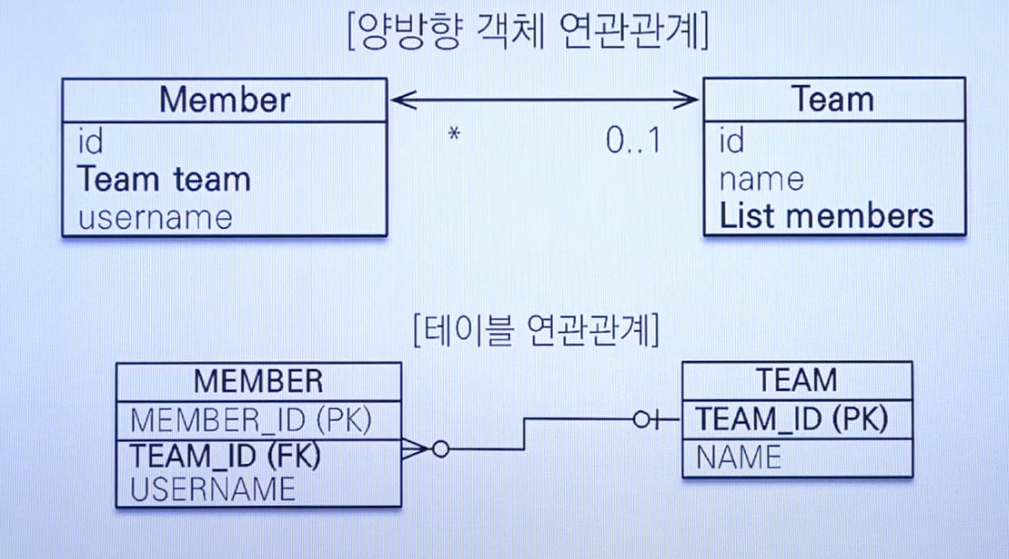 - 객체의 양방향 관계는 사실 양방향 관계가 아니라 서로 다른 단방향 관계 2개 입니다.