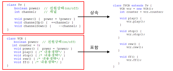 - 비중이 높은 클래스 하나만 상속관계로, 나머지는 포함관계로 한다.
