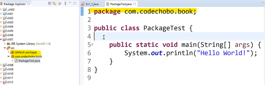 - 같은 소스 파일의 클래스들은 모두 같은 패키지에 속하게 된다. (하나의 소스파일에 단 하나의 public 클래스만 허용한다.)