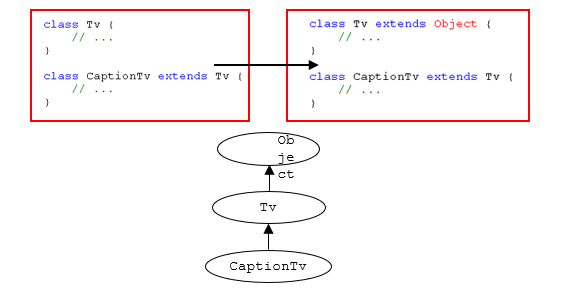 - 부모가 없는 클래스는 자동적으로 Object클래스를 상속받게 된다.(컴파일러가 자동 추가)