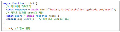 - 네트워크를 통해 서버의 자료를 가져오는 fetch함수에 await를 붙여 자료를 가져올 때 까지 대기하도록 함
