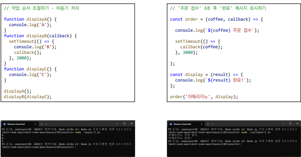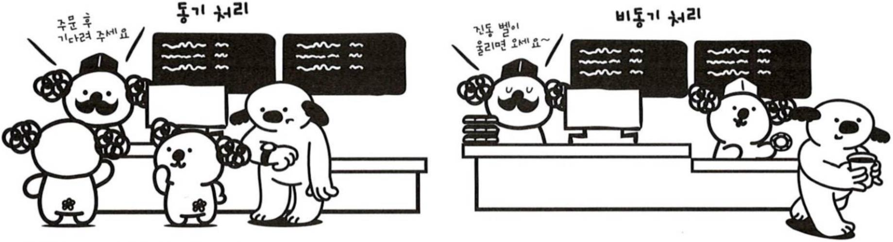 비동기 처리 방식은 앞 사람이 커피를 주문하면 진동벨을 받고 다음 사람의 주문을 받는 것이에요!