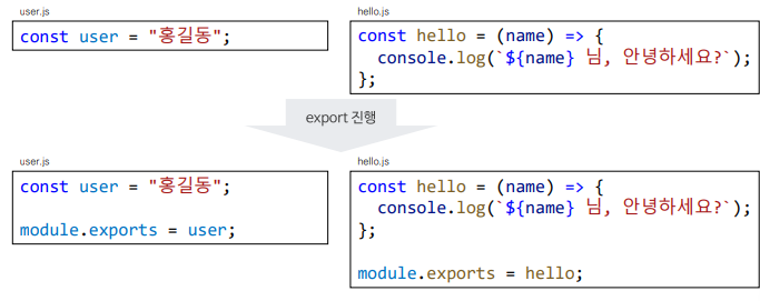 - hello.js에서는 hello라는 함수를 export 함 (현재 파일에서 사용된 기능을 다른 파일에서 사용할 수 있도록 내보냄)