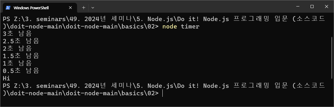 // 남은 시간이 0 이하일 경우 'Hi' 메시지를 표시하고 타이머를 종료